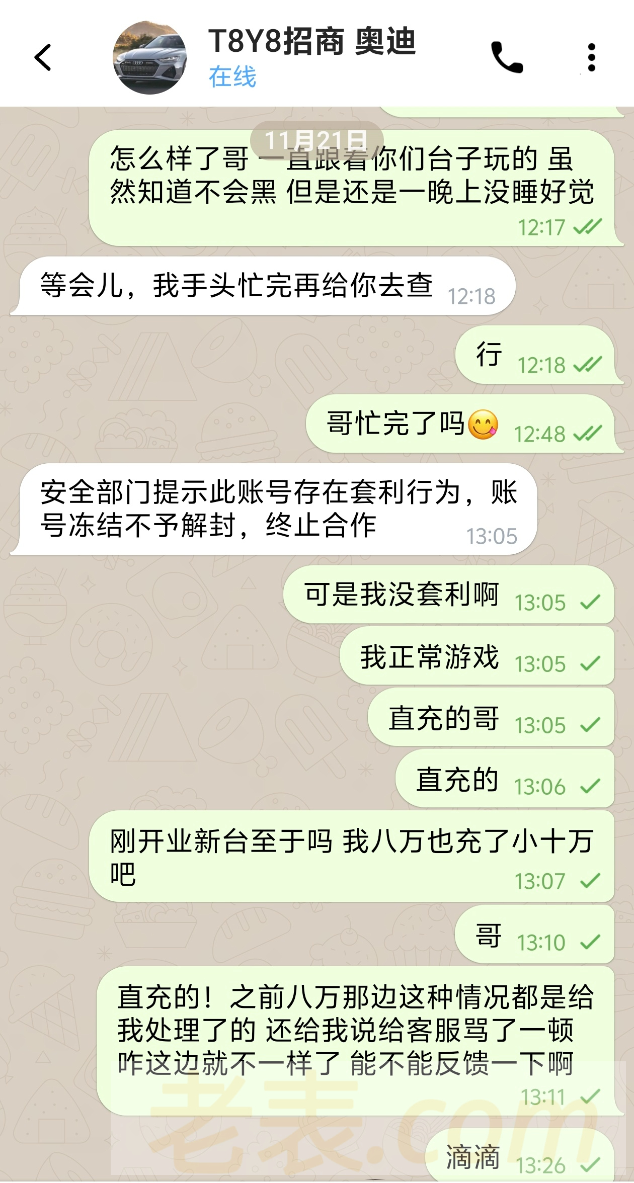 我充值100+100输完了 然后去直充300什么优惠没有领取 买免费输到最后200左右20一拉爆了9200 最后客服说我买免费违规1+1规则 然后我还没感觉什么 准备白天去找徐江他们处理 因为之前在八万给我处理过这种的 也是这种情况 也给我处理好了的 然后奥迪说我违规套利!我直充!哥直充!要不要这么黑 然后那个大卫给踢出群里 并删除我 徐江现在还没理我 谁都没给我解决 我要给你们全部公开